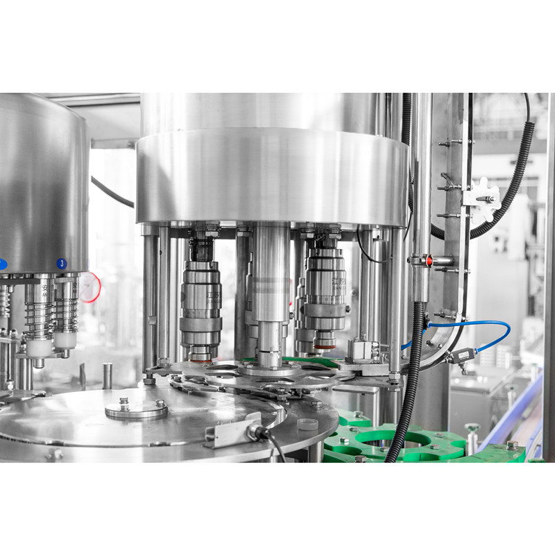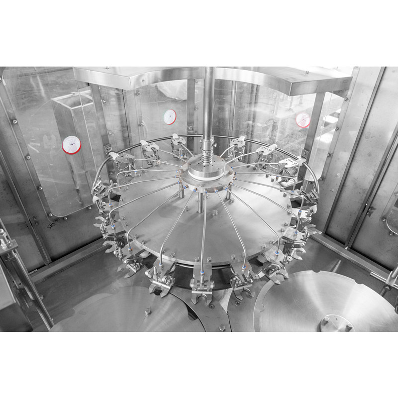 XGF14-12-5三合一灌裝機主要用于礦泉水、純凈水的灌裝作業。本機將沖洗、灌裝、旋蓋三功能合在一個機體上,全過程實現自動化。適用于聚酯瓶、塑料瓶,各部分的適用瓶型調整采用手柄轉動實現,輕松自如,簡便快捷。灌裝方式采用了新型的常壓灌裝,使灌裝速度更快更穩定,所以與同規格的機器相比本機的產 量更高,效益更大。本機采用了先進的可編程控制器(PLC)控制機器的自動運行,進瓶鏈道采用變頻器調整,與主機變頻器相互配合使進瓶運行更穩定可靠,光電檢測各部件的運行狀況。自動化程度高,操作簡便。是礦泉水、純凈水生產廠家理想的首先設備。